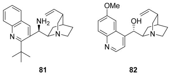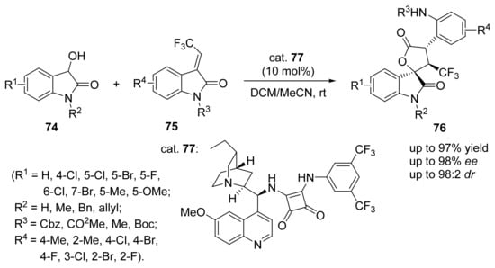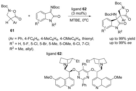 4-Substituted isoxazolidin-5-ones 61 were reacted with isatin-derived imines in the presence of (DHQD)2PYR ligand 62 (Scheme 23) [62]. Reactions performed in methyl tert-butyl ether (MTBE) at 0 °C gave the corresponding Mannich products in almost quantitative yields, and excellent enantioselectivity (99%) and diastereoselectivity (20:1 of d.r.). The obtained products are building blocks for the synthesis of systems with bactericidal properties.