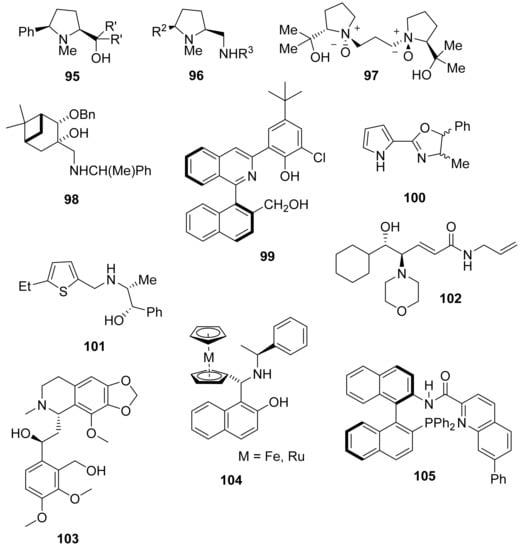 - Leśniak, S.; Rachwalski, M.; Pieczonka, A.M. Optically pure aziridinyl ligands as useful catalysts in the stereocontrolled synthesis. Curr. Org. Chem. 2014, 18, 3045–3065. [Google Scholar] [CrossRef]