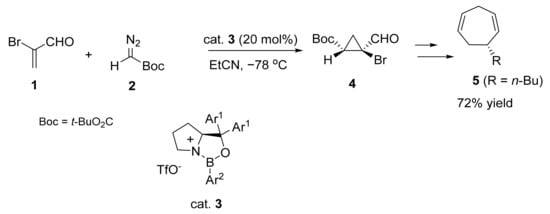 Dictyopterenes are chemical compounds occurring in marine and freshwater environments and being sexual attractants or pheromones [15]. The asymmetric synthesis of Dictyopterene C’ 5 and its derivatives was performed using asymmetric cyclopropanation as one of the steps. α,β-Unsaturated aldehydes 1 and α-substituted α-diazoesters 2 took part in the reaction promoted by a chiral oxazaborolidinium ion catalyst (COBI) 3 (Scheme 1) [16]. Further transformations of cyclopropyl derivatives of type 4 including Julia–Kocienski reaction and Sonogashira and Suzuki coupling led to the corresponding dictyopterenes 5 [16].