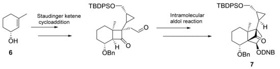 Asymmetric Simmons–Smith cyclopropanation using diiodomethane and diethylzinc was applied in multi-step synthesis of the core of solanoeclepin A 7 (Scheme 2) which is a hatching agent of potato cyst nematodes [17]. Tricyclo [5.2.1.0] decane skeleton of solanoeclepin A was constructed starting from (R)-seudenol 6 (Scheme 2) [17].