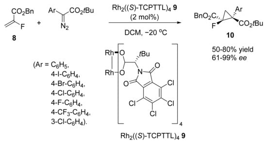 Two further literature reports on the asymmetric cyclopropanation reaction include both experimental and theoretical studies [18,19]. In the first one, α-fluoroacrylates 8 were subjected to enantioselective cyclopropanation promoted by chiral rhodium catalysts 9 (Scheme 3) [18]. The corresponding cyclopropyl junctions 10 were formed with excellent enantio- and diastereoselectivities [18]. Monofluorinated cyclopropane derivatives have inter alia, antiviral (anti-herpetic) and antibacterial properties; the presence of fluorine and cyclopropane increases the bioavailability, selectivity and similarity to the respective receptors.