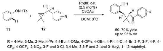 Chiral rhodium catalysts were also applied in stereoselective cyclopropanation of N-phenoxylsulfonamides 11 with cyclopropenyl secondary alcohols 12 (Scheme 4) [19]. A very wide spectrum of substrates was tested and, in most cases, the desired products were obtained in high chemical yields with excellent enantioselectivities and diastereoselectivity [19]. This type of cyclopropane moiety is the structural basis of drugs such as milnacipran and (+)-Tranylcypromine.