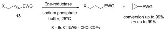 An original and interesting approach to the cyclopropanation process was reported by Breinbauer et al. The enzymes ene reductases were used as catalysts in the reaction of reduction in carbon-carbon double bonds in α,β-unsaturated compounds 13 with electron-withdrawing group [20]. It turned out that this type of enzyme also catalyzes the process of creating carbon-carbon bonds; thus, the aforementioned α,β-unsaturated systems underwent reductive cyclization. This new enzymatic transformation allows access to chiral cyclopropyl derivatives with excellent ee (up to 99%) (Scheme 5) [20].