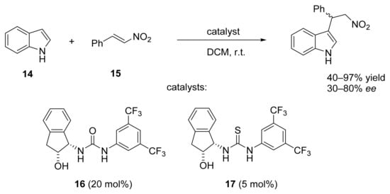 Herrera et al. studied the activation of urea- and thiourea-derived catalysts in an asymmetric Friedel–Crafts reaction of indole 14 and nitrostyrene 15 as model substrates (Scheme 6) [25,26].
