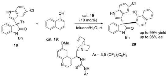 An asymmetric alkylation of sulfonylindoles of type 18 with naphthol and its derivatives was performed by Han and co-workers using bifunctional catalysts bearing urea or a thiourea motif [27]. The corresponding products of type 20 were formed in the highest yields and enantiomeric excesses using thiourea 19 (Scheme 7). Additionally, among many solvents tested, the authors showed that the two-phase water–toluene system is the best one [27]. Taking into account the structure of compound 18, the proposed method may be useful in the synthesis of such natural compounds as (+)-gliocladin C, (+)-bionectin A or leptosin D.