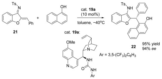A similar Friedel–Crafts transformation consisting in arylation of 1-azadienes of type 21 was reported in 2020 [28]. The desired product 22 was obtained in very high chemical yield (95%), and with an excellent enantiomeric ratio (97:3), when the urea-analog of system 19 (19a) was applied as catalyst (Scheme 8) [28]. The same reaction was investigated using thiourea bifunctional catalyst 19 which led to the appropriate chiral product with a moderate yield (72%) and enantioselectivity (62% of ee) [29]. It should be stressed that chiral triarylmethanes are the structural skeleton of many systems that exhibit antiviral and antibacterial effects, as well as a drug for tuberculosis or skin diseases.