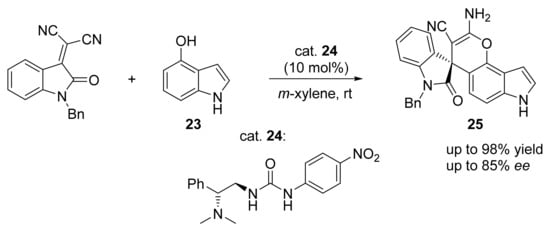 Friedel–Crafts alkylation/cyclization of 4-hydroxyindole 23 promoted by bifunctional tertiary amine-urea catalyst 24 was reported by Lin and Duan et al. [30]. The corresponding spirooxindole-pyranoindole products of type 25 were formed very efficiently in terms of yield and enantioselectivity (Scheme 9) [30]. Indole derivatives are found in many drugs, while systems structurally similar to compound 25 have predominantly anti-malarial activity (e.g., NID609).