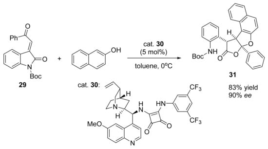 Furo [2,3-b] benzofuranones were synthesized via efficient asymmetric Friedel–Crafts alkylation/hemiketalization/lactonization cascade reaction [32]. The search for new methods of the synthesis of chiral furo [2,3-b] benzofuranones is desirable due to the high biological (e.g., antibacterial, anti-thrombotic) activity of such systems. In the model reaction, 3-ylidene oxindole 29 was treated by 2-naphthol. The corresponding product 31 was obtained in the highest yield (83%) and enantioselectivity (90% of ee) in toluene when squaramide 30 was used as chiral promoter (Scheme 11). Thiourea derivatives were also tested but the results were not as significant as for squaramide [32].