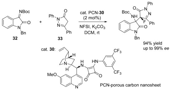 Porous carbon nanosheet-supported squaramide 30 catalysts were successfully used for highly enantioselective Friedel–Crafts reaction between isatin ketimine 32 and pyrazolone 33 (Scheme 12) [33]. The best results in terms of yield (94%) and ee (up to 99%) were achieved after 15 min in DCM in the presence of potassium carbonate and N-fluorobenzenesulfonimide (NFSI) [33].