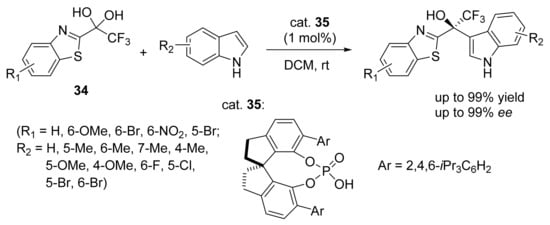 Chiral phosphoric acids acted as catalysts in asymmetric Friedel–Crafts alkylation of indoles with trifluoromethyl ketone hydrates 34 bearing a benzothiazole moiety (Scheme 13) [34]. The most successful transformation was achieved in case of the use of 35 as the chiral catalyst [34]. In this synthesis, special emphasis was placed on the chiral α-trifluoromethyl tertiary alcohol, which is present in many Anti-HIV drugs.