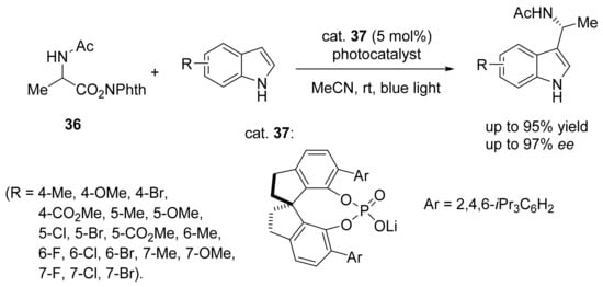 Similar catalysts were examined in the asymmetric Friedel–Crafts reaction of indoles with in situ generated N-acyl imines from alanine-derived N-(acyloxy) phthalimide 36 (Scheme 14) [35]. Reactions were performed under blue LED light in the presence of ruthenium or iridium photocatalysts [35]. The most efficient model reaction (86% yield, 90% ee) was carried out in the presence lithium salt 37.