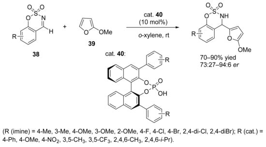 Enantioselective Friedel–Crafts reaction of cyclic N-sulfimines 38 with 2-methoxyfurane 39 catalyzed by chiral BINOL-derived phosphoric acids was described in 2019 (Scheme 15) [36]. The application of chiral derivative 40 in o-xylene at room temperature gave the best results in terms of chemical yield and enantiomeric ratio [36]. The asymmetric FC reaction in which furan is the substrate is less understood as compared to indole. The furan ring is present in many natural compounds: (-)-furodysinin, fraxinellone (can be used as a pesticide but is non-toxic to mammals) or lophotoxin (it is an antagonist of the nicotinic acetylcholine receptor).