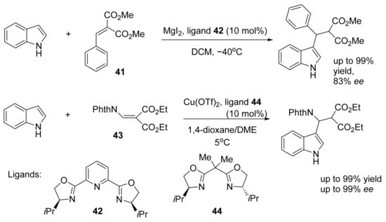 Beletskaya et al. described asymmetric Friedel–Crafts reactions of indoles with arylidene malonates 41 in the presence of magnesium iodide [43] and with phthaloyl-protected aminomethylenemalonate 43 in the presence of Cu(OTf)2 [44]. The processes were catalyzed by PyBox [43] or iPrBox [44], respectively (Scheme 16).