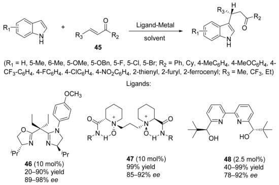 The asymmetric reaction of indoles with α,β-unsaturated carbonyl compounds 45 (enones) was carried out using three similar catalytic systems (Scheme 17) [45,46,47]. In the first contribution, reaction was promoted by imidazoline-oxazoline 46 complex with Cu(OTf)2 (acetonitrile, room temperature), leading to indole derivatives acting as novel α-glucosidase inhibitors in vitro [45]. The second approach comprises a utilization of chiral N,N-dioxide 47-scandium(III) complexes in dichloromethane at 35 °C [46], and finally, the third work relies on the application of cationic aqua complex of 2,2′-bypiridine 48 with palladium(II) in water at room temperature [47].
