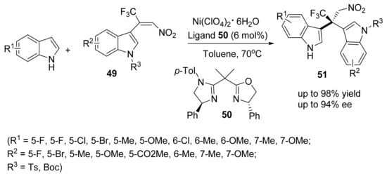 Chiral bis (3-indolyl) methanes 51 were synthesized in high yields and in a highly enantioselective manner via asymmetric Friedel–Crafts alkylation of indoles with trifluoromethylated nitroalkenes 49 (Scheme 18) [48]. Reactions were promoted by a nickel(II) complex of imidazoline oxazoline 50. Systems of type 51 have antibacterial and antifungal properties, inhibit the growth of cancer cells, and are also colorimetric sensors.