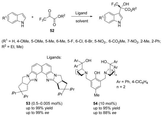 Asymmetric Friedel–Crafts reactions of indoles with trifluoromethyl pyruvate 52 were independently described in 2018 [49,50]. Kitamura et al. applied complexes of BOX-type 53 with Cu(OTf)2 in cyclopentyl methyl ether (CPME) at 0 °C [49]. In turn, Wang and Yang et al. carried out this process using Trost’s dinuclear zinc-ProPhenol catalyst 54 in dichloromethane at 10 °C in the presence of diethylzinc (Scheme 19) [50].