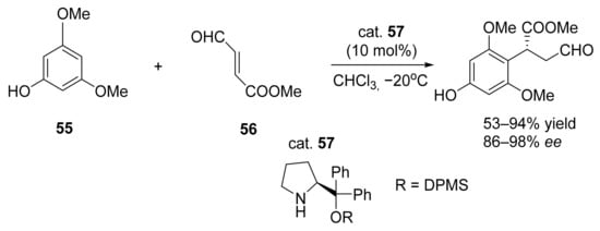 The organocatalytic Friedel–Crafts alkylation of phloroglucinol derivatives 55 with enals 56 was described by Zu et al. [54]. The corresponding chiral products were afforded in high yields and enantioselectivities (Scheme 20) when diphenylprolinol TMS ether 57 was applied as the catalyst. This reaction opens up access to total synthesis of (+)-aflatoxin B2 [54].