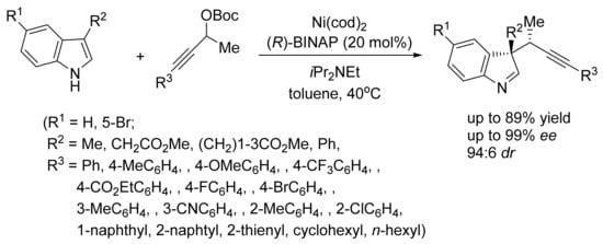 The asymmetric propargylation of 3-substituted indoles via Friedel–Crafts process catalyzed by Ni(cod)2 and (R)-BINAP afforded the corresponding products bearing internal alkyne group with excellent enantio- and diastereoselectivities (Scheme 21) [55].