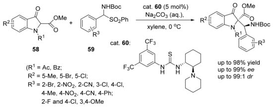 Bifunctional thiourea systems were employed to the reaction between 3-indolinone-2-carboxylates 58 to N-Boc-benzaldimines generated in situ from α-amidosulfones 59 [61]. The best results in terms of chemical yield, enantio- and diastereoselectivity were obtained with the use of thiourea 60 (Scheme 22) [61]. Chiral derivatives of isatins occur in the nature; these are compounds such as (+)-isatisine A, trigonoliimine or mersicarpine. All three exhibit antiviral properties.