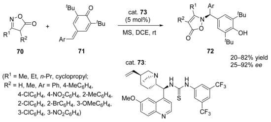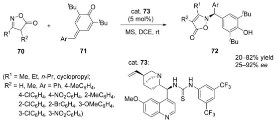 Enantioselective 1,6-aza-Michael addition reaction of 4(H)-isoxazol-5-ones 70 to p-quinone methides 71 promoted by various organocatalysts was described by Blay and Pedro et al. [73]. The isoxazol-5-one ring is present in many natural compounds, and there are many examples of compounds from this group that are inhibitors of various enzymes. The properties of this ring mean that some derivatives are successfully used in photonics. The desired isoxazolin-5-one derivatives 72 were formed with the greatest efficiency in dichloroethane (DCE) at room temperature in the presence of 3Å molecular sieves under action of thiourea system 73 (Scheme 28) [73].