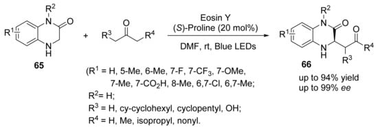 One of the most common chiral catalysts used in the asymmetric Mannich reaction, namely L-proline, was combined with the corresponding photocatalysts and used in enantioselective Mannich reaction of dihydroquinoxalinones 65 with ketones [64] and in the synthesis of C2-quaternary indolin-3-ones [65]. The dihydroquinoxalinone skeleton is found in many natural and synthetic compounds, which are drugs and plant protection products. In the first work, chiral quinoxaline junctions 66 were obtained in high yields (up to 94%) and very high enantioselectivities (up to 99% of ee) (Scheme 25) [64]. Dihydroquinoxalin-2-one 65 under the irradiation of visible light and in the presence of Eosin Y and oxygen is oxidized to quinoxalin-2(1H)-one (imine).