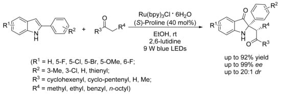 - Dong, C.-L.; Ding, X.; Huang, L.-Q.; He, Y.-H.; Guan, Z. Merging visible light photocatalysis and l-/d-proline catalysis: Direct asymmetric oxidative dearomatization of 2-arylindoles to access C2-quaternary indolin-3-ones. Org. Lett. 2020, 22, 1076–1080. [Google Scholar] [CrossRef]