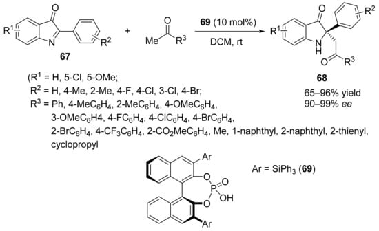 Chiral phosphoric acid 69 was employed as catalysts in asymmetric Mannich reaction of cyclic C-acylimines 67 with ketones (Scheme 27) [66]. C2-quaternary indolin-3-ones 68 were formed with excellent values of chemical yield and stereoselectivity [66].