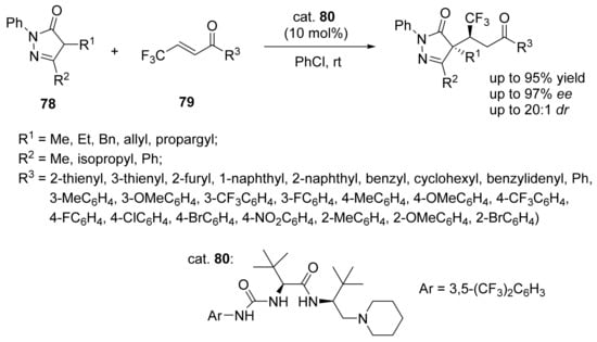 The Michael addition reaction constitutes one of the most powerful tools of construction of C-C bonds in modern synthetic organic chemistry. The number of different Michael donors and acceptors is large and constantly increasing; therefore, this reaction is still the subject of numerous studies. The Michael reaction in the asymmetric version is often a key step in the synthesis of many natural products [67]. The search for new chiral catalysts for this asymmetric transformation is still a challenge for various research groups [68]. Many recent reports inform about the use of bifunctional organocatalysts, such as thiourea–tertiary amine systems [69]. Moreover, Michael additions performed in the presence of zinc ions also enjoy quite a lot of interest [70]. Currently, target materials in the asymmetric Michael addition reaction are very often isoxazole-5-ones and isoxazolidin-5-ones [71], and pyrazolones [72].