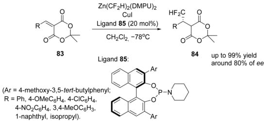 - Endo, Y.; Ishii, K.; Mikami, K. Chiral copper-catalyzed enantioselective Michael difluoromethylation of arylidene meldrum’s acids with (difluoromethyl)zinc reagents. Tetrahedron 2019, 75, 4099–4103. [Google Scholar] [CrossRef]