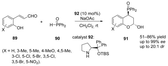 - Sun, H.; Li, Y.; Liu, W.; Zheng, Y.; He, Z. Organocatalytic asymmetric cascade cyclization reaction of o-hydroxycinnamaldehydes with diphenylphosphine oxide. Chin. Chem. Lett. 2018, 29, 1625–1628. [Google Scholar] [CrossRef]