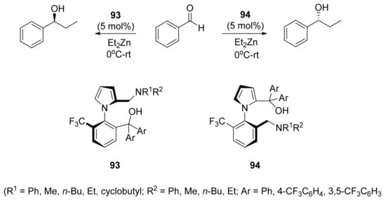 - Prause, F.; Wagner, S.; Breuning, M. Enantioselective addition of diethylzinc to aldehydes catalyzed by 5-cis-substituted proline derivatives. Tetrahedron 2019, 75, 94–101. [Google Scholar] [CrossRef]