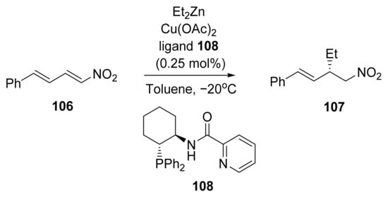 - Rexiti, R.; Zhang, Z.-G.; Lu, J.; Sha, F.; Wu, X.-Y. Regioselective and enantioselective Cu(II)-catalyzed 1,4-conjugate addition of diethylzinc reagent to nitrodienes. J. Org. Chem. 2019, 84, 1330–1338. [Google Scholar] [CrossRef] [PubMed]