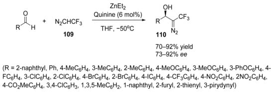 - Rong, M.-Y.; Yang, L.; Nie, J.; Zhang, F.-G.; Ma, J.-A. Construction of chiral β-trifluoromethyl alcohols enabled by catalytic enantioselective aldol-type reaction of CF3CHN2. Org. Lett. 2019, 21, 4280–4283. [Google Scholar] [CrossRef] [PubMed]