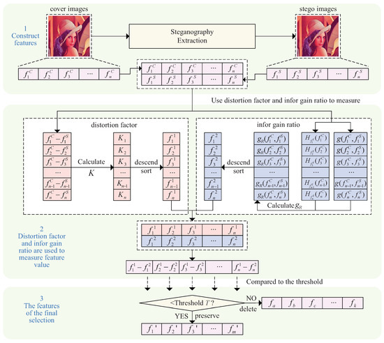 In previous research, researchers have often used one criterion first to select some of the features that are useful for detecting the stego images (written as “First Selection”), and then using another criterion for a second selection based on the “First Selection” [33,34,35,36,37]. Although this does reduce the feature dimension, the two criteria are used sequentially, i.e., one criterion is measured ahead of the other, so that there are inconsistencies in the measurement using the two criteria.