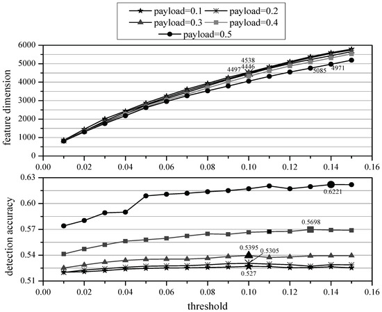 In Figure 2, the horizontal axis represents threshold value and the vertical axis represents the corresponding feature dimension and detection accuracy, and the five lines from top to bottom represent the effects of the DCTR features selected at five different payloads, and the points of optimal performance at each payload are processed and labeled with values. It can be clearly seen from the figure that the S-FUND method can maintain or even improve the detection accuracy of DCTR feature while significantly reducing the feature dimension, which proves the effectiveness of the S-FUND method.