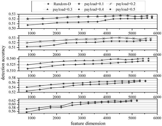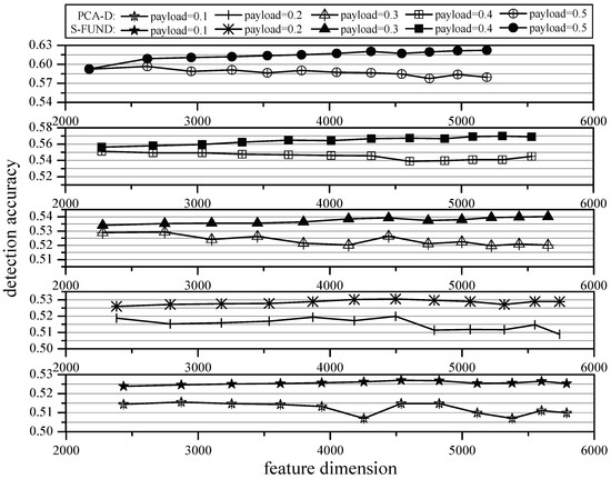 In Figure 5, the horizontal axis represents the feature dimension, the vertical axis represents the corresponding detection accuracy, and the five line graphs from top to bottom represent the effects of S-FUND and PCA-D methods for selecting DCTR feature at five different payloads. From Figure 5, it can be seen that the S-FUND method has better detection accuracy than the PCA-D method when the two methods are reduced to the same dimension at different payloads. For example, when payload = 0.1, the feature dimensions selected by the two methods are 5791 and 2435, and the differences in detection accuracy are 1.54% and 0.95%. When payload = 0.3, the feature dimensions selected by the two methods are 5653 and 2280 and the differences in detection accuracy are 2.00% and 0.51%. When payload = 0.5, the feature dimensions selected by the two methods are 5192 and 2621, and the differences in detection accuracy are 4.25% and 1.23%.