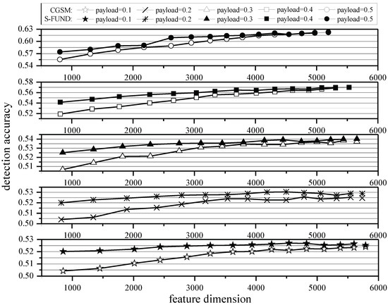 In Figure 4, the horizontal axis represents the feature dimension and the vertical axis represents the corresponding detection accuracy. Five line graphs from top to bottom represent the effects of S-FUND and CGSM methods for selecting DCTR feature at five different payloads. From Figure 4, it can be seen that the S-FUND method has better detection accuracy than the CGSM method when both methods are reduced to the same dimensions under different payloads. Simultaneously, as the number of selected features decreases at different payloads, the difference in detection accuracy between the two methods increases—for example, when payload = 0.1, the difference in detection accuracy between the two methods increases from 0.12% to 1.6%.