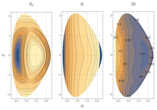 - Yavorskij, V.A.; Schoepf, K.; Andrushchenko, Z.N.; Cho, B.H.; Goloborod’ko, V.Y.; Reznyk, S.N. Analytical models of axissymmetric toroidal magnetic fields with non-circular flux surfaces. Plasma Phys. Control. Fusion 2001, 43, 249. [Google Scholar] [CrossRef]
