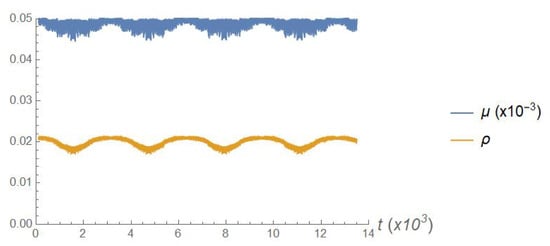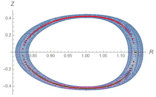 The particles trajectories are computed by integrating Hamilton’s equations of motion with the symplectic partitioned Runge–Kutta algorithm of sixth order described in [7]. We initialized particles with a low kinetic energy; their Larmor radius turns out about of the minor radius. This does not ensure automatically that is small, since the analysis produced in [6] shows that there are regions where L is substantially smaller than the minor radius. However, for the specific trajectory that we are considering, we are confident that the motion is adiabatic. Figure 2 shows a part of the time trace of the computed magnetic moment: it is clearly constant to a great degree. In Figure 3, finally we produce an example of the projection of the trajectory. The blue dots are the numerically integrated full trajectory; the red dots are the solutions of Equation (10) which, by construction, coincide with the guiding centre coordinates. The two sets of points clearly overlap fairly well.