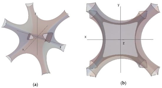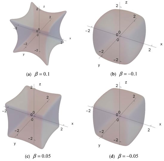 Under the condition n >> 1, a typical container shape can be visualized with the equipotential surface , which is shown in Figure 2 for different values of and the potential level . The shape’ symmetries reflect the evenness of function (3) with respect to each of its arguments. The term ‘soft wall’ means that the shape of container still depends upon the number h. However, within the considered range of total energies, qualitative changes of surfaces are insignificant due to the specific of power functions with high exponents. Therefore, images in Figure 2 can be viewed as a proper visualization the billiards boundaries. Possible high energy effects of topological changes, when inclusions may escape from the potential wells, will be discussed later in this text. As follows from the shape of the surface in Figure 2a,c, the inclusions interacting with potential walls are subjected to the repelling reaction forces. The only difference with the case of stiff wall dispersive billiards is that the impulsive reaction forces are still continuous in both temporal and spatial coordinates.