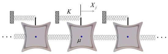 where is the displacement of jth container, whose dynamics are constrained to be one-dimensional, whereas three-dimensional motions of particles are described with their relative displacements measured inside each container from its center of symmetry; the strength of coupling between containers is assumed to be unity, the stiffness of base springs is K, and all the potential wells of the chain are given by the same function.