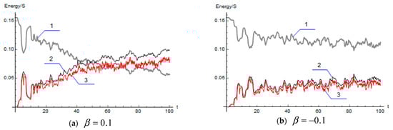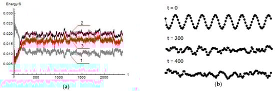 The total energy per one cell under the initial conditions corresponding to the propagating sine wave: 1—containers, 2—particles, and 3—the kinetic energy particles; the corresponding evolution of wave shapes is illustrated below in Figure 5. (a,b) Short term response, and (c,d) tenfold increase of time range.