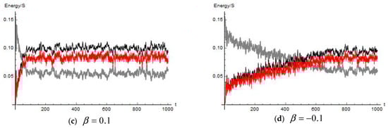 In the rigid-body limit, , the contour V(x,y) = h resembles either dispersing [6] or stadium-type [7] billiards as the main geometrical parameter β switches its sign from positive to negative. The corresponding boundaries are shown in the upper part of Figure 1b for three different values of the parameter β with sample particle’ trajectories. It was shown that the light particles μ inside the ‘potential container’ M can absorb the energy from the oscillating container for quite a long period of time by delaying the Poincaré recurrence beyond any physically reasonable temporal intervals of the system. We emphasize that no phenomenological dissipation nor specific initial conditions were imposed. Nonetheless, the energy flow from the container (donor) to the inner particle (acceptor) appeared to have statistically irreversible trends whenever the dynamics of particle inside the potential well are chaotic. As mentioned above, Figure 1b gives three examples of chaotic trajectories inside containers of different shapes. The corresponding recurrence diagrams and energy responses of main oscillator versus the number of its cycles are shown below each of the three containers. A possible mechanism leading to the illustrated phenomena may associate with the so-called stochastic acceleration of cosmic particles as originally explained by E. Fermi [8] by their cyclic ‘elastic’ collisions against moving magmatic fields. According to his model, two types of collisions must be happening, namely, ‘head-on collisions’ with an energy gain and ‘overtaking collisions’ with an energy loss. Gain and loss, however, do not average out completely, because a head-on collision is slightly more probable than an overtaking collision due to the greater relative velocity. In our case, a chaotically moving particle should also have both types of collisions against the moving walls of its container. The physical nature of forces considered in cosmology is quite different, however. In our case, a naïve explanation is that chaotically moving particles collide with the container walls more often when the wall and particle move towards each other. As a result, particles should experience stronger pulses more frequently by gradually absorbing the kinetic energy from the container walls rather than losing it. Note that such interpretations are based on chaotic behaviors of individual particles. For that reason, let us summarize a comparison with the classical thermodynamic problem of energy transfer from a moving piston into a gas inside an adiabatic cylinder [9]. The main distinctive features are as follows: