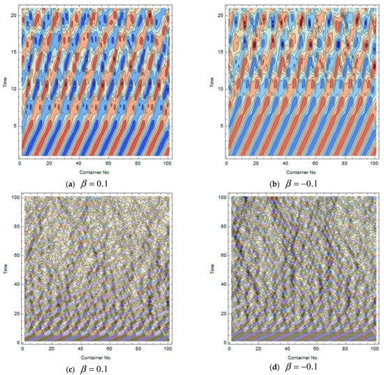 Cancellation of the propagating wave due to almost irreversible energy transfer from the chain of containers into its inner particles: (a,b) short-term patterns of the displacement field; (c,d) long-term displacement field showing transition from the propagating wave to the chaotic dynamics of the chain of containers as their energy was absorbed by the inner particles as shown in Figure 4a,b.