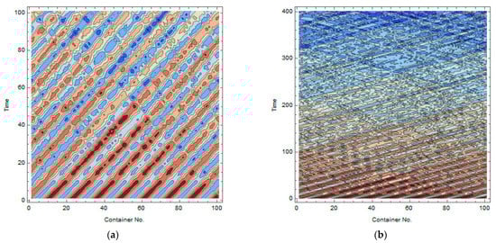 The main goal of simulations was to obtain a numerical evidence of one-directional energy flows from the chain of massive containers to their inclusions. Such simulations were conducted with system (2) of S = 100 containers under the cyclical boundary conditions and the initial dynamic states corresponding to the propagating sine-wave, , , where and . The amplitude and wave number were assigned as A = 0.5 and k = 16, respectively. We also assumed that at t = 0 in order to keep the particles near their equilibrium states at the initial time while other initial coordinates of the particles were chosen as small random numbers within the interval generated as different for different containers. Other parameters were chosen as: K = 1.0, γ = 1.0, n = 6, and β = 0.1. The result of simulation is illustrated by Figure 4a and Figure 5a,c to show that the wave propagates through the chain of containers with almost no disturbance until the particles became involved in the dynamic process and developed interactions with the potential walls. As follows from the graphs, this occurred at about time units. Then, once the chaos in the particle motions was developed, the energy flow acquired a one-directional trend from the containers to the particles, which is clearly confirmed by Figure 4a,c. It is also seen from curves 2 and 3 that the collective energy of particles maintained mostly kinetic form since the potential energies of their interactions with the walls were spike-wise and chaotic. Due to the chaoticity of particles and thus incoherency of this process between different containers, the wave shape became irregular with the loss of the propagation property as follows from the wave contour lines in Figure 5a,c. Note that the plots are given for different time intervals in order to illustrate both short- and long-term dynamics. The loss of propagation appeared quite completed by the time . As seen from Figure 4b,d, obtained for the case , in contrast to the repelling case, there was only a minor energy flow from the containers to inclusions. Still, Figure 5b,d reveals that the wave switched to the standing vibration mode with chaotic amplitudes even faster. This occurred despite the irregular patterns emerging somewhat later (compare Figure 5a,b). Although both effects were caused by the interaction of inclusions with containers, the underlying mechanisms were quite different. The wave became trapped as soon as the interaction of inclusions with the container walls violated the translational symmetry of the chain of containers. However, this did not guarantee a one-directional trend in the energy exchange between containers and inclusions. Such a trend most likely associated with the Fermi type of acceleration of inclusions under a stronger chaoticity due to the stochastic billiard effect. The effect had a different physical nature and depended upon the geometry of container shapes. Namely, whereas the wave trapping may occur even in the case of one-dimensional ‘containers’, the stochastic acceleration required the inclusion dynamics to be strongly chaotic, which has the capacity to develop in two- or three-dimensional billiard-type containers with either repelling or specific ‘stadium type’ boundaries. Moreover, multidimensional containers provide additional degrees of freedom for absorbing the energy from the one-dimensional wave.