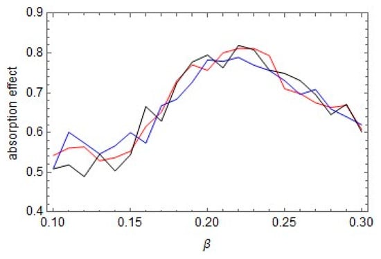 Estimation of the energy-absorbing effect as a ratio of the accumulated kinetic energy of particles at final time per the initial total energy of the system, , as a function of the container shape, ; the ensemble of curves was obtained from three different simulations under random initial positions of particles.