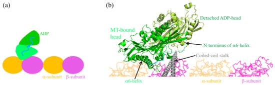 - Hwang, W.; Lang, M.J.; Karplus, M. Kinesin motility is driven by subdomain dynamics. eLife 2017, 6, e28948. [Google Scholar] [CrossRef] [PubMed]