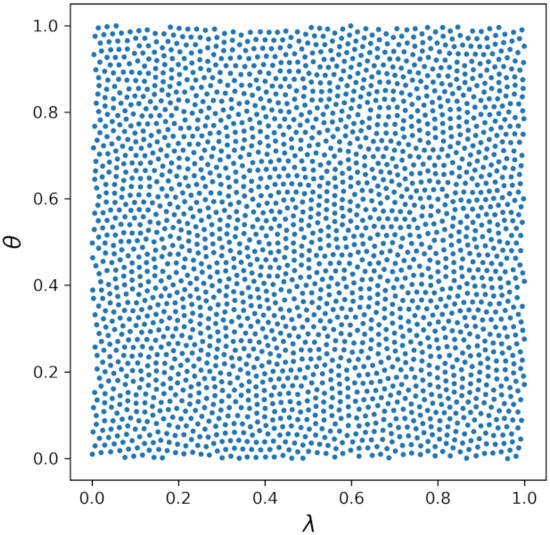 Finally, to improve the conditioning of the generated node sets we apply an annealing process based upon a repulsive force between nodes similar to the ones described in [60,61]. An example point cloud generated by the periodic Poisson disk sampling and the following annealing procedure are shown in Figure 1.