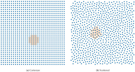 We evaluate the spatial convergence on scattered (S) and Cartesian (C) point clouds for three stencil sizes (9, 13, and 21). Details of the approximations, along with their abbreviations, are provided in Table 1. For the RBF-FD stencils we use polyharmonic splines (PHS) augmented with polynomials (also known as PHS + poly). The MLS-based stencils use a polynomial basis and a Gaussian weight function. The scattered point clouds (see Figure 2b) were generated according to the procedure described in Section 2.4. Due to the irregular packing the scattered node sets contain fewer nodes than the Cartesian ones for the same domain size.