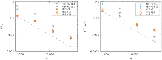 For Cartesian node layouts, in Figure 3 we observe second order convergence behavior for both the MLS and RBF-FD discretizations. Interestingly, the viscosity and velocity errors of the MLS discretization are one order of magnitude lower than the RBF-FD ones. A modified equation analysis of the discrete Lax–Wendroff operators to identify the leading error terms could shed more light on this result. For the PHS + poly RBF-FD method, larger stencil sizes lead to smaller errors in agreement with previous findings [61,62]. At a fixed polynomial degree of the RBF-FD, the polynomial terms take over the initial terms in the Taylor expansion of the approximated function, while the additional RBF terms act on the remaining error, thereby slowly decreasing the error with an increase in stencil size. For the MLS approximation, the effect of stencil size is less dramatic, although a more definitive study would also need to consider the weight function influence [48].